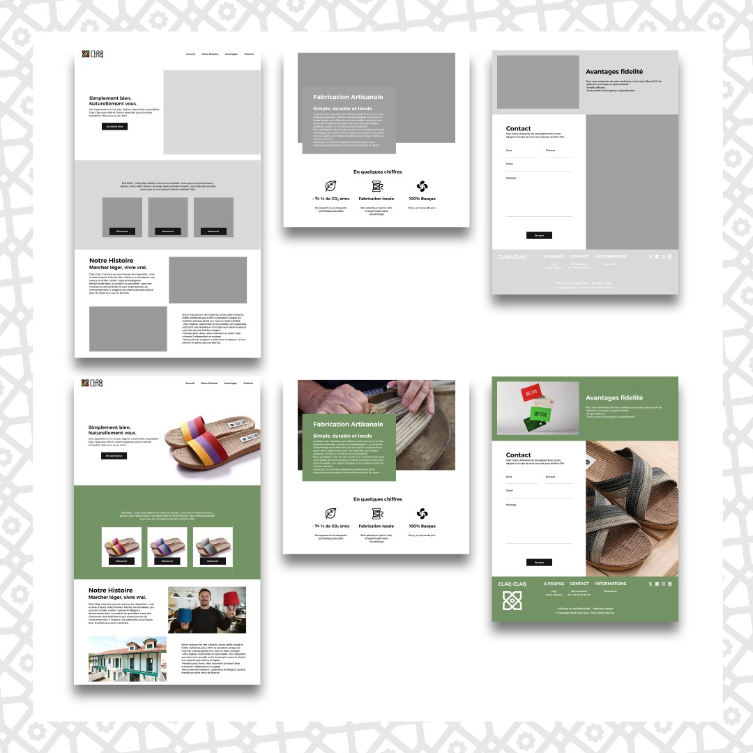 Projet complet de création graphique pour une marque fictive de claquettes. Mise en place d’une analyse stratégique complète. Réalisation de l’identité visuelle (logo, couleurs, charte graphique), déclinaison sur différents formats print (cartes de visite et de fidélité) et conception d’un site web one page prototypé sur Figma.