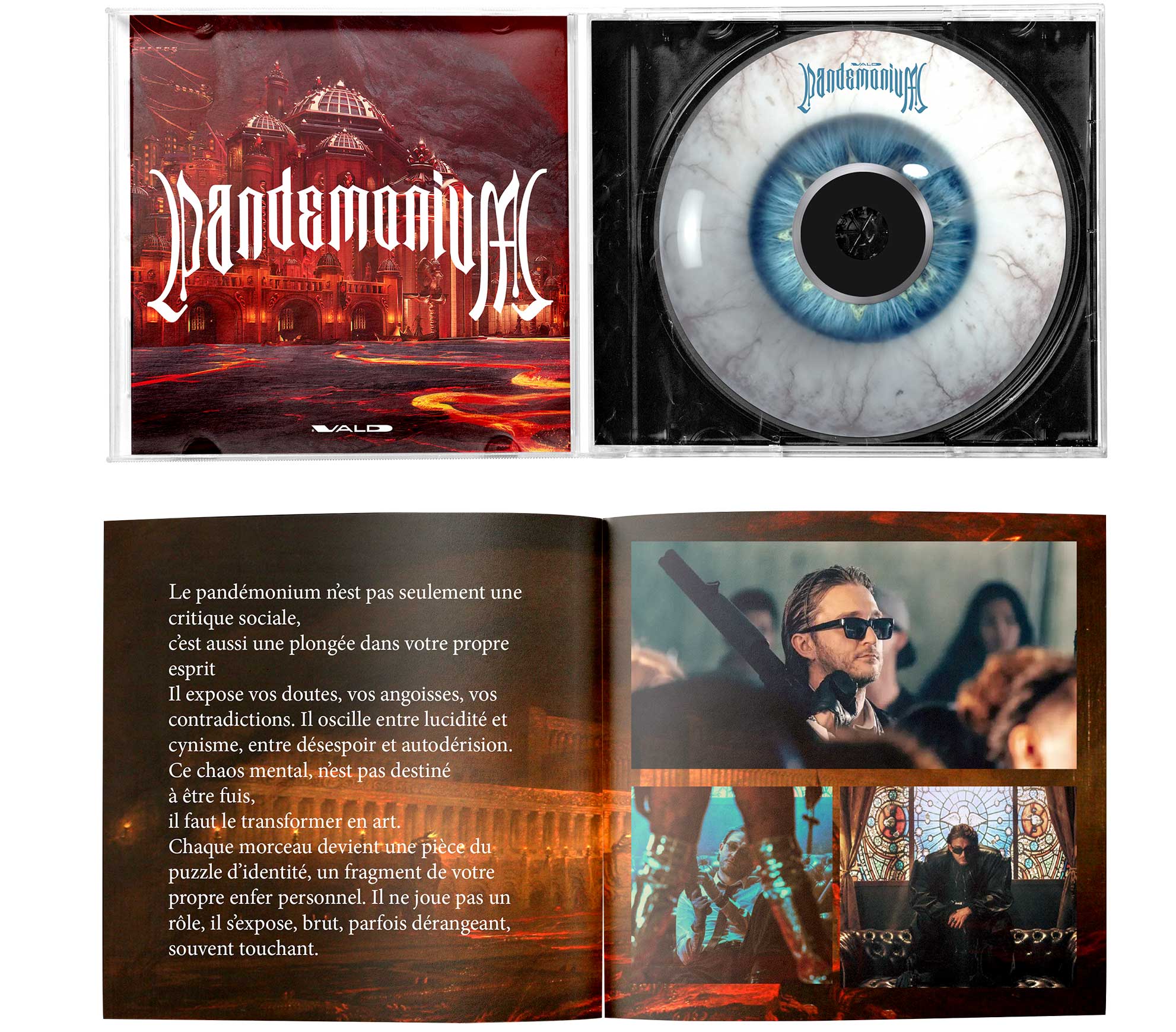Travail en équipe concernant l’organisation de la sortie d’un album, avec notre version de Pandemonium de Vald. Réalisation de covers, d’un livret intérieur, d’un vinyle et d’un CD (le livret n’est pas une de mes productions mais est essentiel à la présentation du CD). J’ai également contribué à la campagne de communication et au développement du site de l’album. Une fois l’ambiance visuelle déterminée, j’ai pu ensuite contribuer à la campagne de communication autour de la sortie de l’album, avec l’idée d’une séparation des annonces ainsi que la création d’un engouement grandissant via les réseaux sociaux.